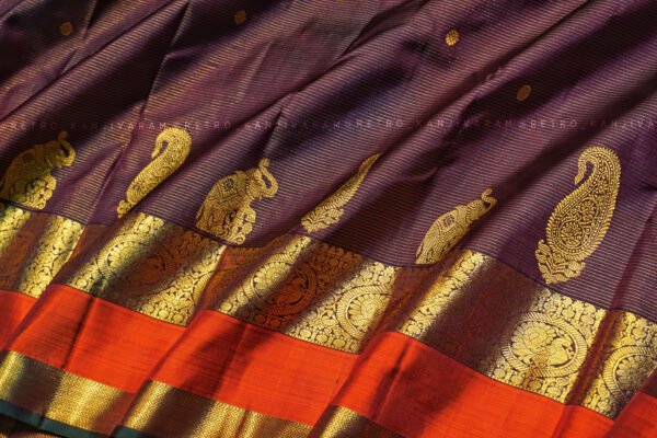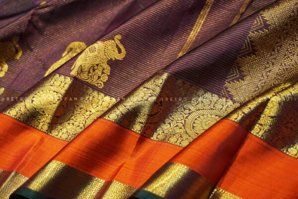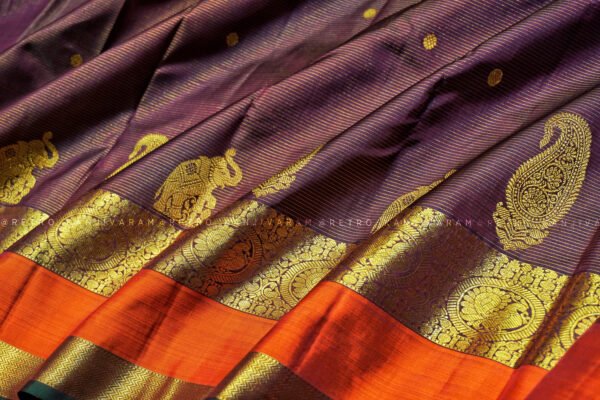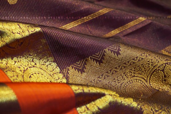 The Retta Petta border, known for its double-line symmetry, is a classic Kanjivaram hallmark. The orange highlight running through the center adds a gentle contrast, breaking the monotony while preserving traditional aesthetics.