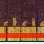 Crafted using pure mulberry silk and original gold zari, this saree is not just a garment but a legacy piece—designed for women who value tradition, authenticity, and understated luxury. The deep coffee brown tone combined with intricate Vaira Oosi weaving, rudraksha buttas, and classic elephant and mango motifs makes this saree a rare heirloom-worthy treasure.