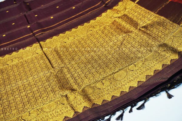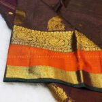 The body color of this saree is a deep coffee brown, chosen carefully to enhance both the zari and the motifs. The shade is neither too dark nor too light, making it universally flattering for all skin tones.