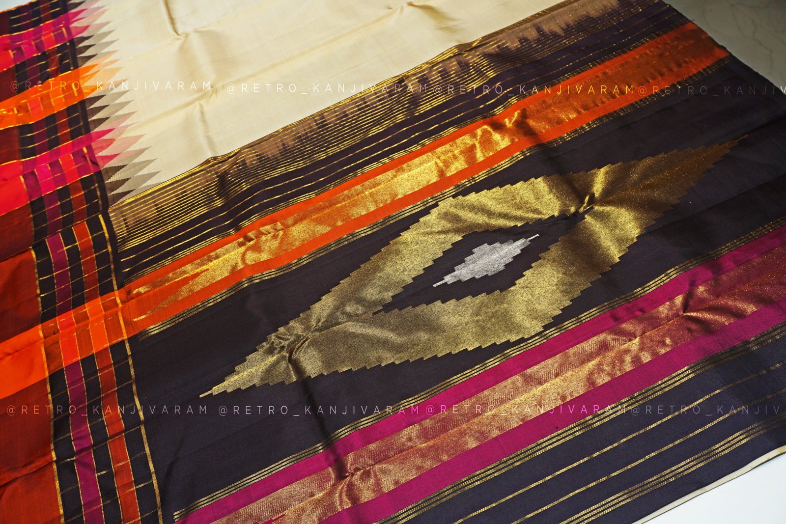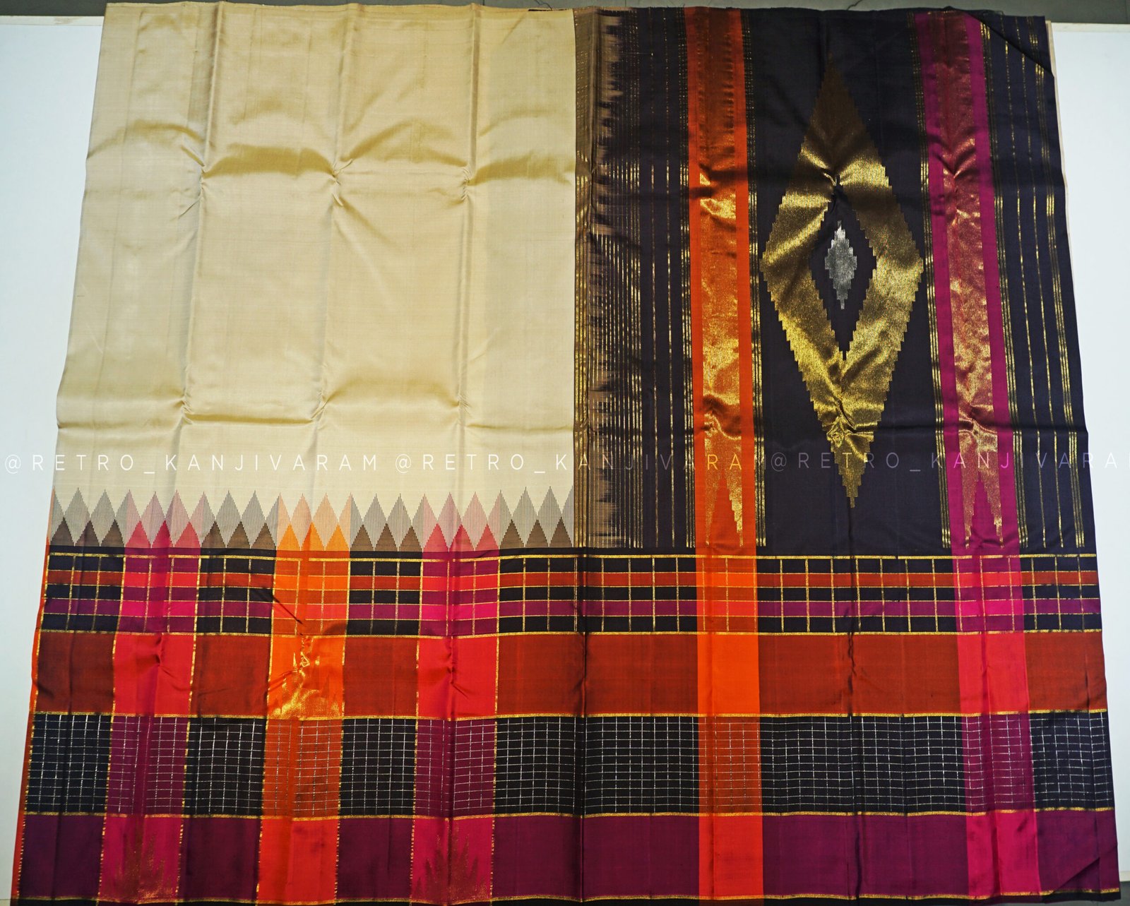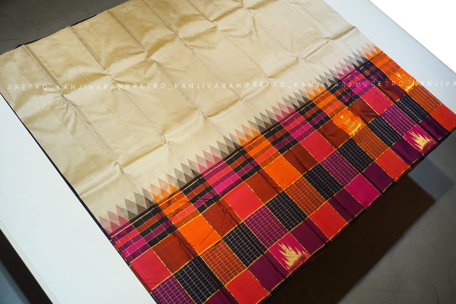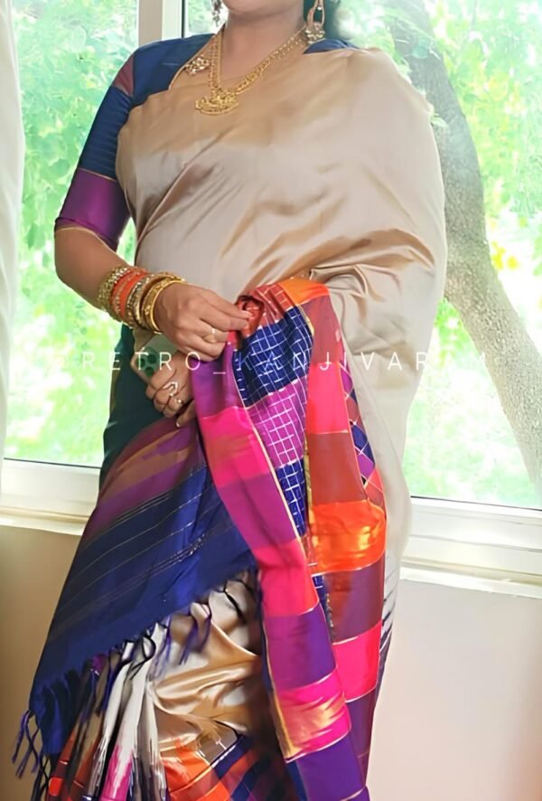Cream Kanjivaram Silk Saree In Multi Colour Temple Border And Pallu (RKSS12)