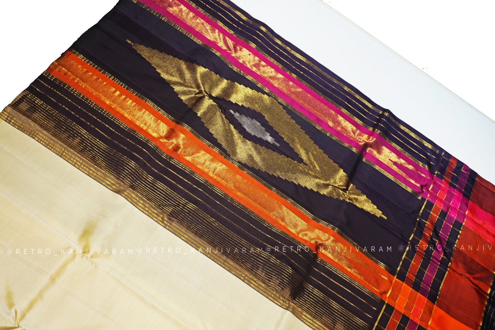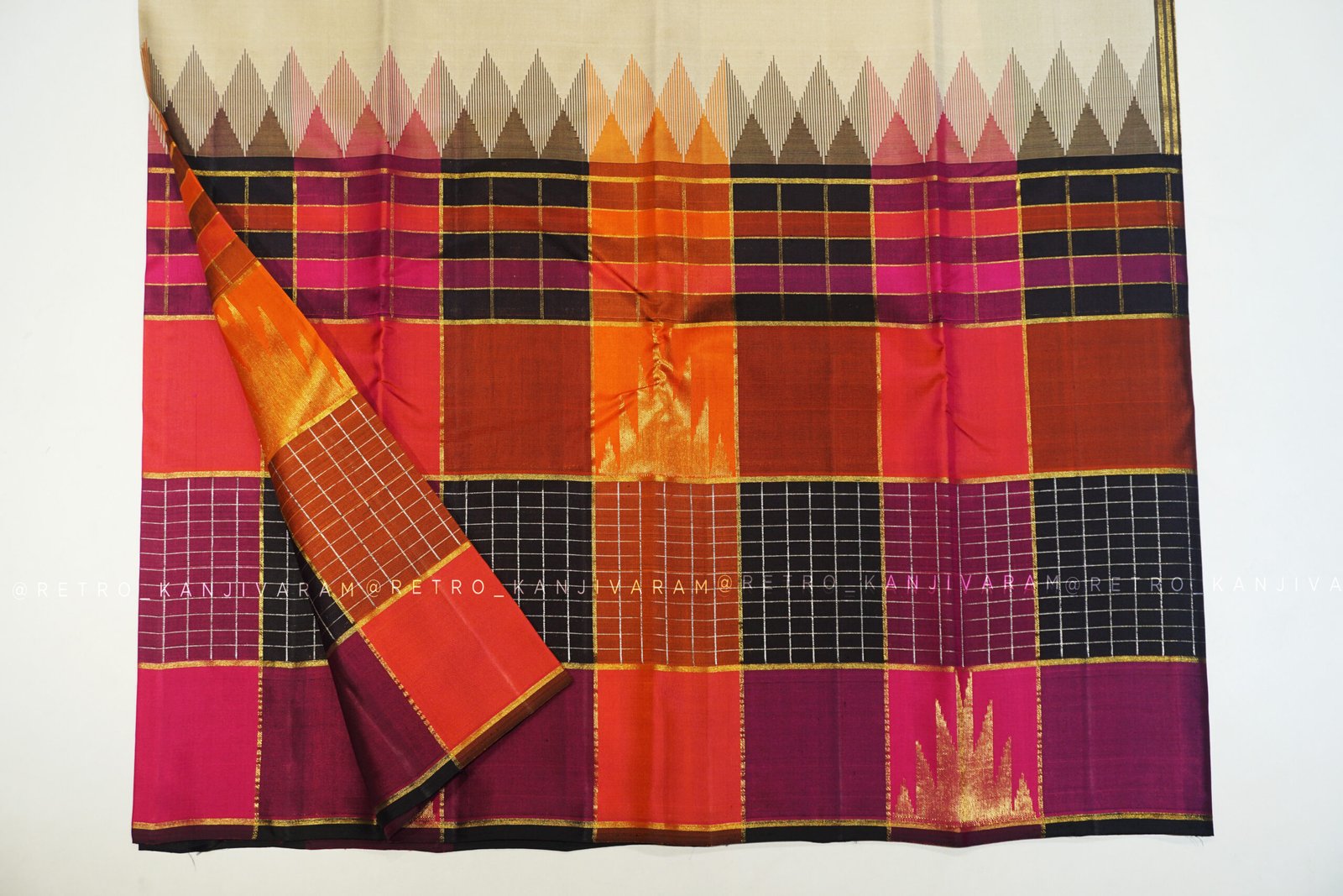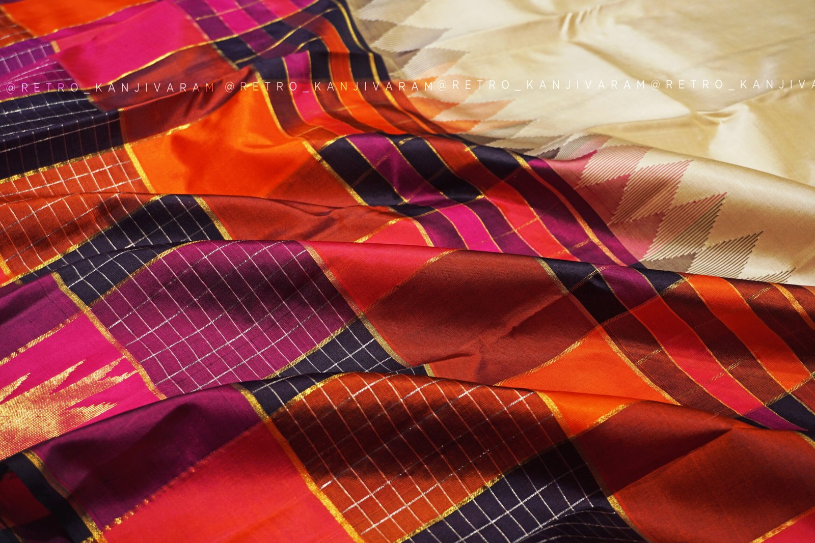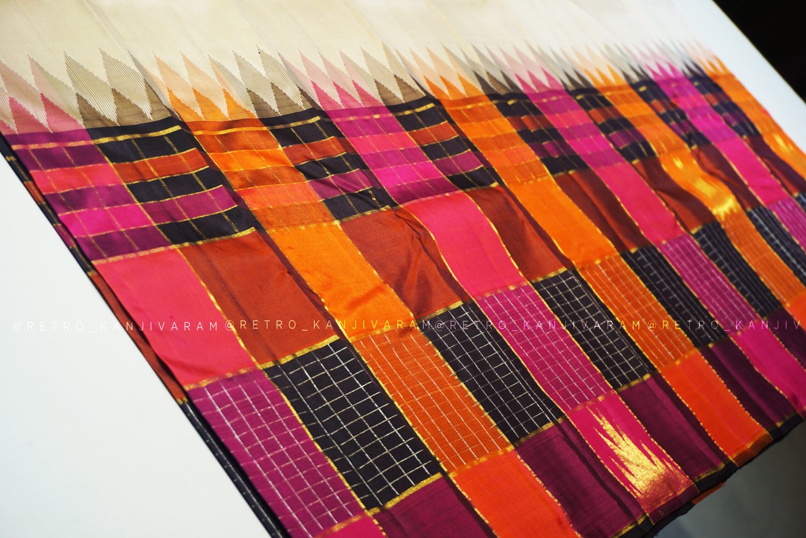 Cream Kanjivaram Silk Saree In Multi Colour Temple Border And Pallu (RKSS12)