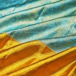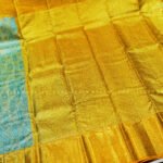 The contrast between the calm sea blue body and the vibrant mango yellow border creates a visually stunning combination that feels both refreshing and traditional. This color pairing is especially popular for weddings, temple functions, and festive celebrations.