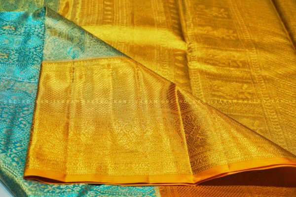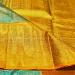 This Sea Blue Kanjivaram Silk Saree with Mango Yellow Border Combination is more than festive attire it is a cultural treasure. With proper care, it will remain radiant for generations, becoming a cherished heirloom passed down with love and pride.