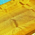 The pallu of this sea blue kanjivaram silk saree is woven in a mango yellow shade with gold zari, perfectly complementing the border. Designed with a simple thick gold zari pallu, it reflects classic Kanjivaram elegance without excessive heaviness.
