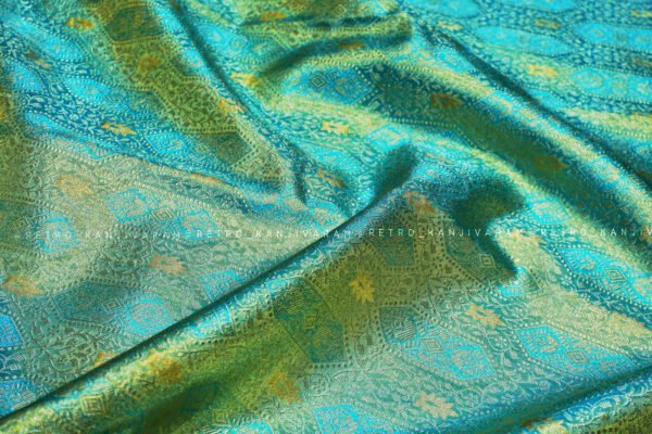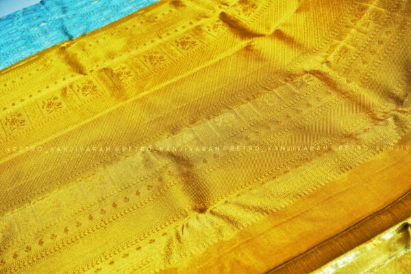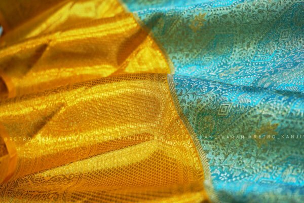 At Retro Kanjivaram, only original pure gold zari is used never artificial or tested substitutes. This ensures that your sea blue kanjivaram saree retains its brilliance, strength, and value for decades.