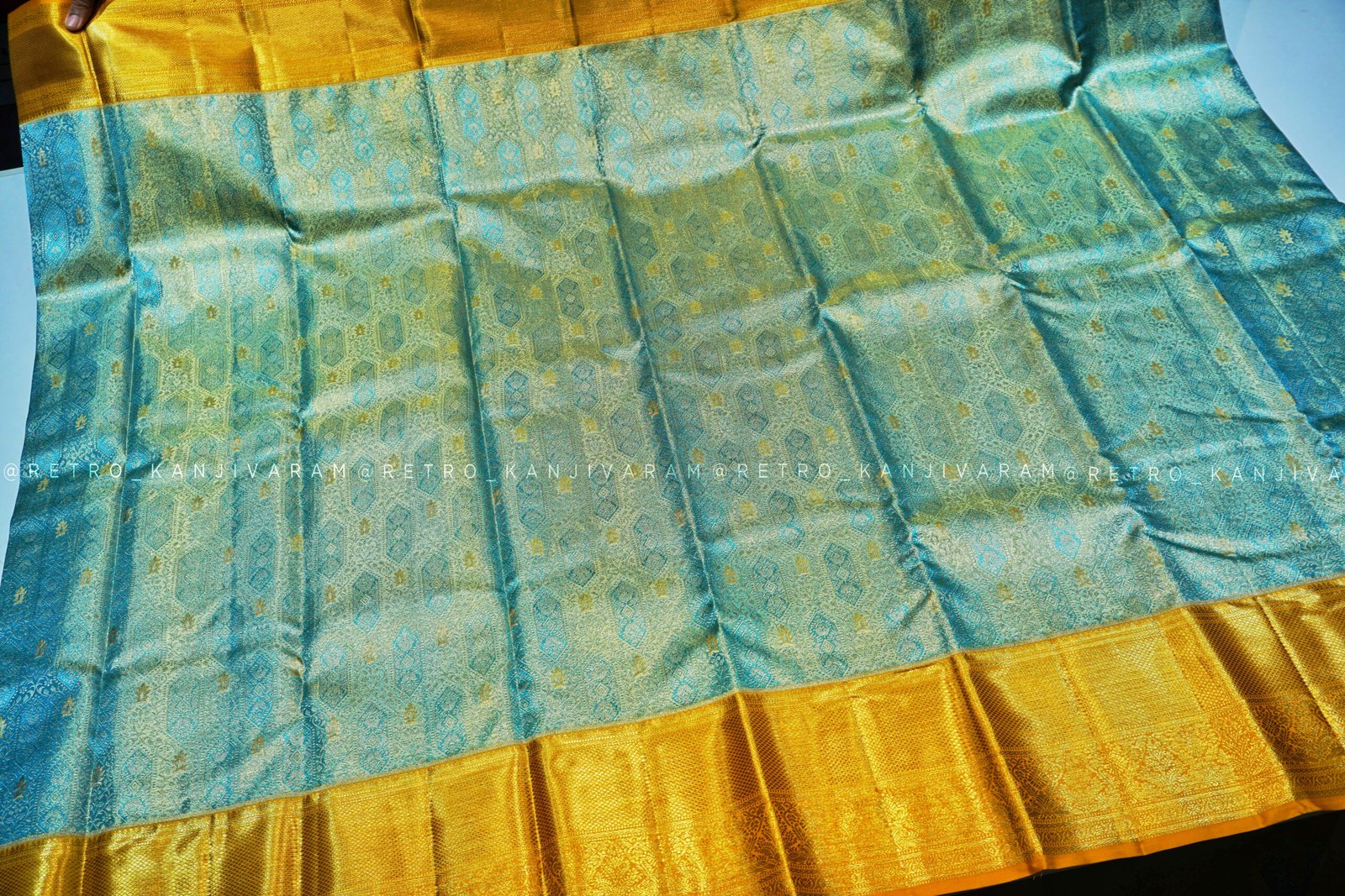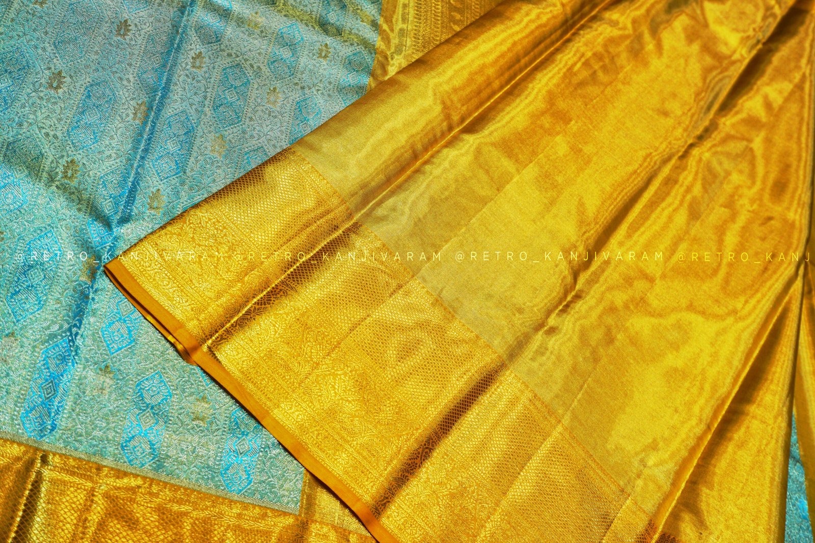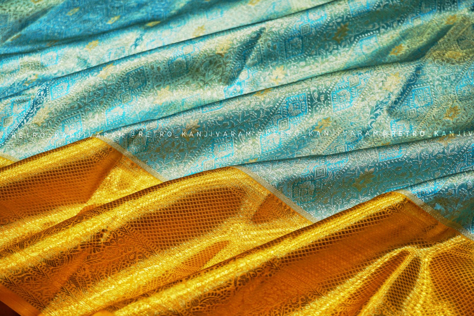 Graceful as ocean waves and radiant like morning sunlight, the Sea Blue Kanjivaram Silk Saree with Mango Yellow Border Combination from Retro Kanjivaram is a breathtaking celebration of color, culture, and craftsmanship. Woven by master artisans using age-old Kanchipuram techniques, this saree beautifully blends refreshing hues with rich traditional aesthetics. Designed for women who appreciate authenticity and timeless elegance, this sea blue kanjivaram saree is a perfect embodiment of South India’s legendary weaving heritage.