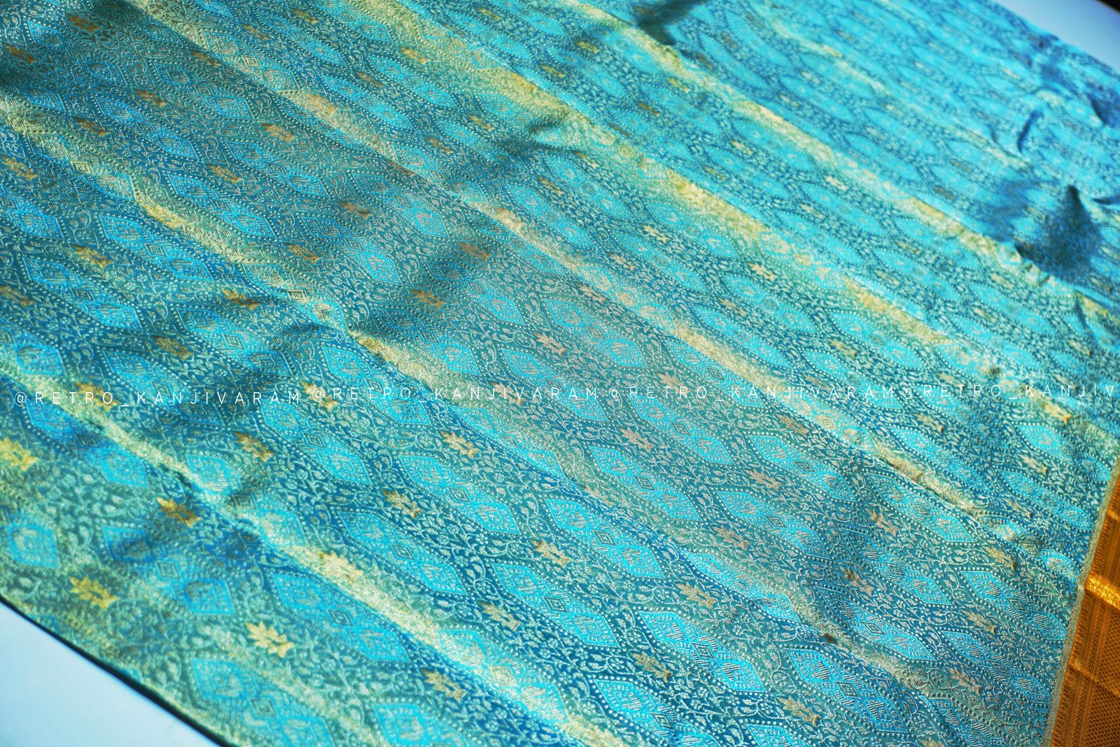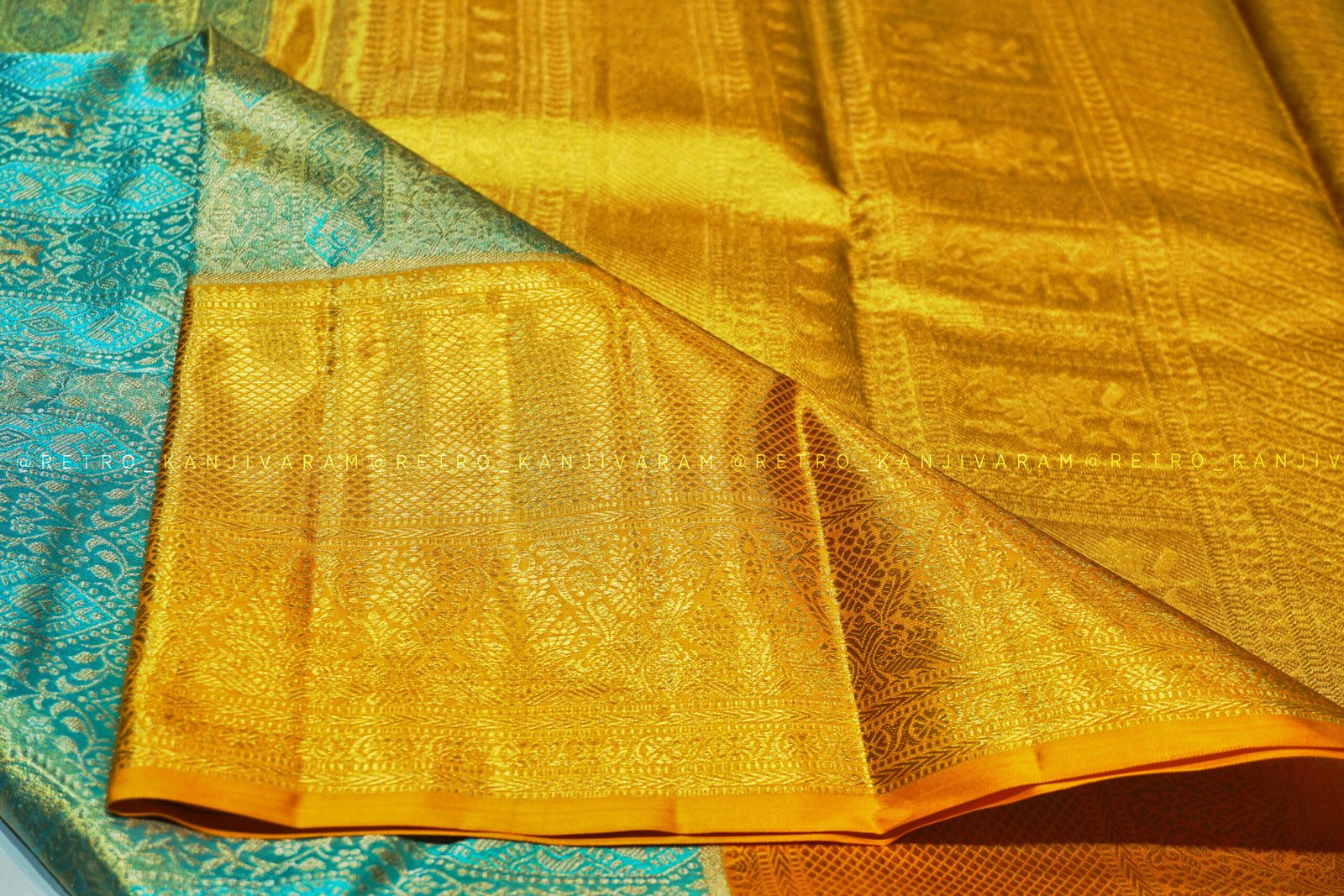 At Retro Kanjivaram, only original pure gold zari is used never artificial or tested substitutes. This ensures that your sea blue kanjivaram saree retains its brilliance, strength, and value for decades.