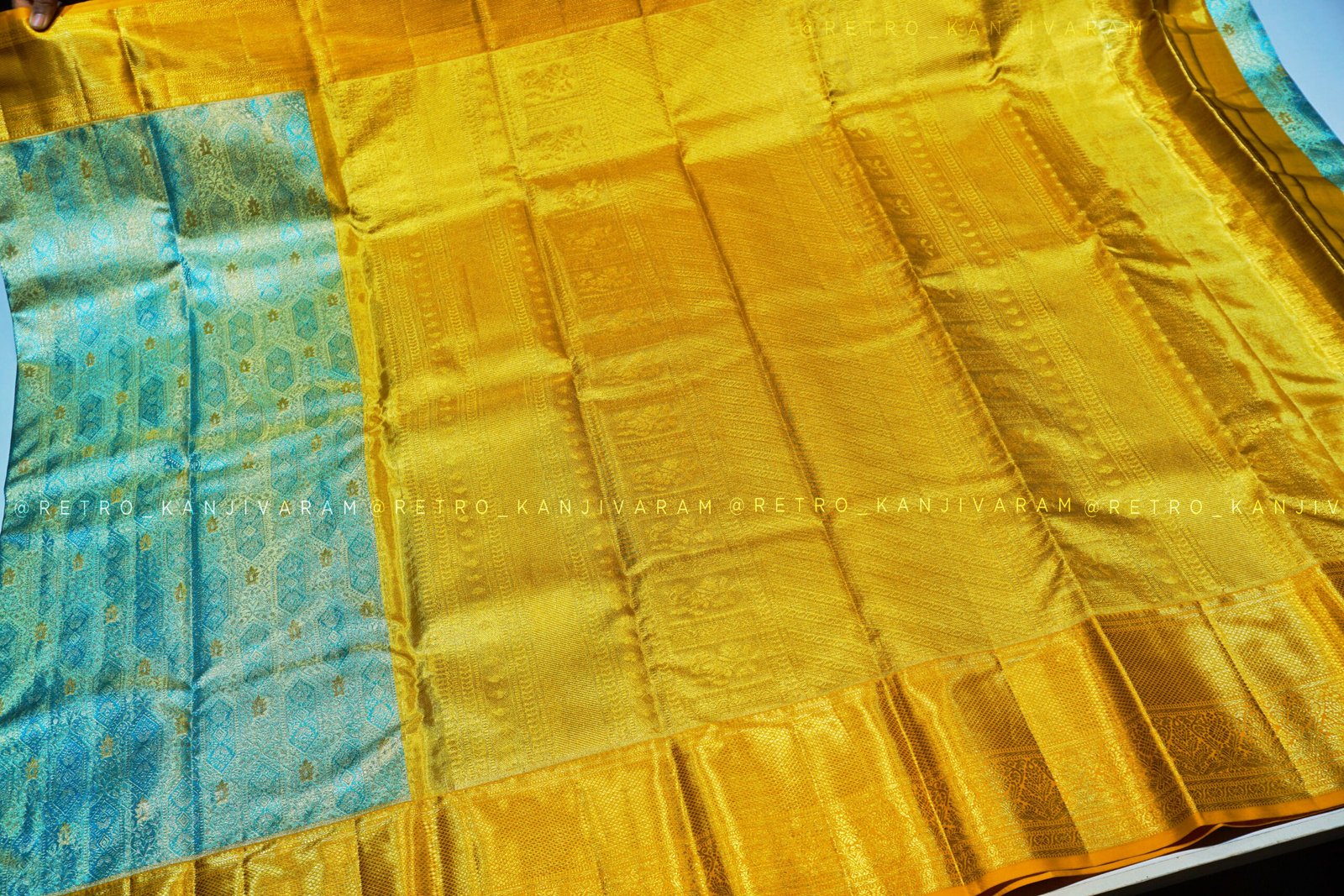 Refreshing in sea blue, vibrant in mango yellow, and rich in pure gold zari, this sea blue kanjivaram saree is a timeless masterpiece of South Indian weaving. From its vintage body design and traditional border to its simple yet thick gold zari pallu, every detail reflects authenticity, elegance, and heritage.