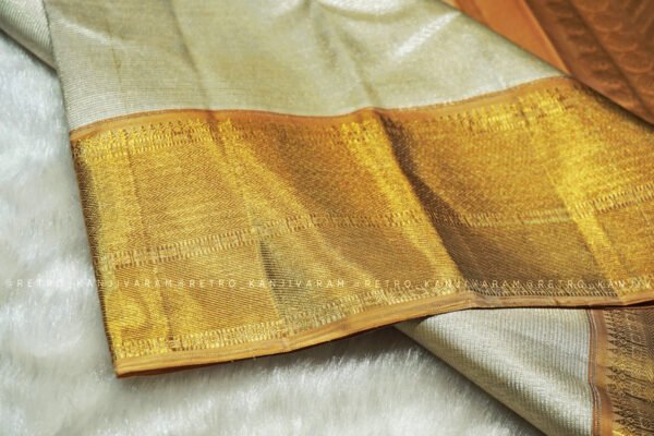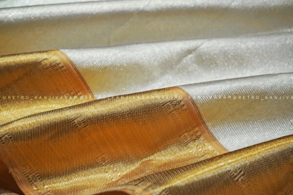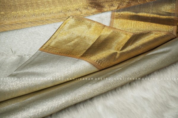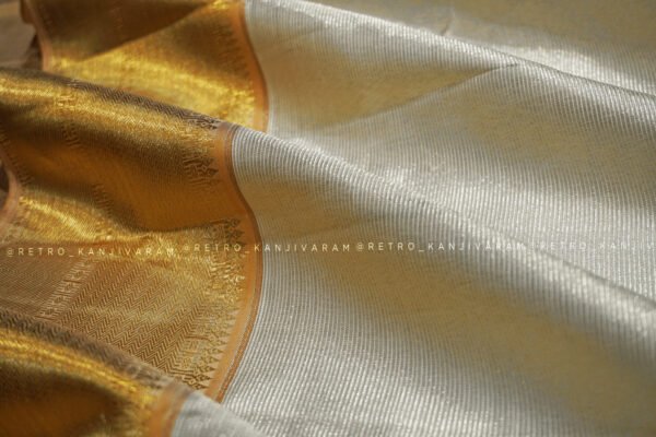 Graceful, radiant, and eternally classic, the Silver Kanjivaram Silk Saree in Gold Border from Retro Kanjivaram is a magnificent tribute to the timeless beauty of Kanchipuram’s weaving heritage. This saree is designed for women who appreciate subtle luxury, authentic craftsmanship, and heirloom-worthy textiles. Woven with devotion using pure mulberry silk and original pure gold zari, this Silver kanjivaram saree stands as a symbol of sophistication, tradition, and understated grandeur.