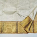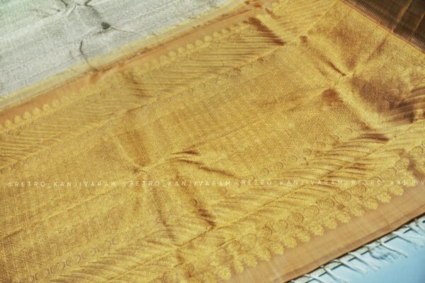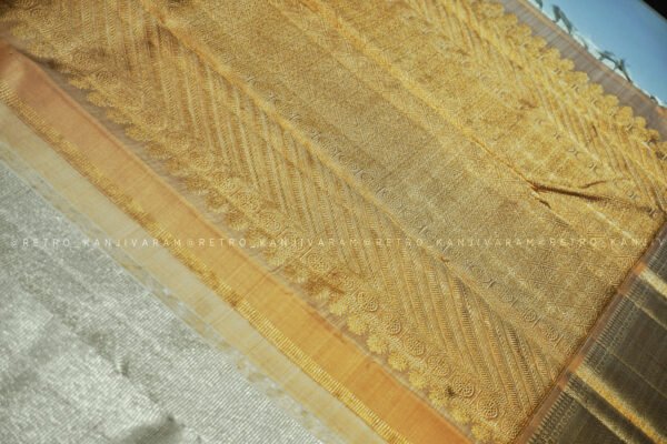 The pallu of this Silver kanjivaram silk saree is woven in a beige shade with thick gold zari, featuring a traditional design inspired by classic Kanchipuram motifs. The beige tone complements both the silver body and gold border, creating a seamless and harmonious transition.